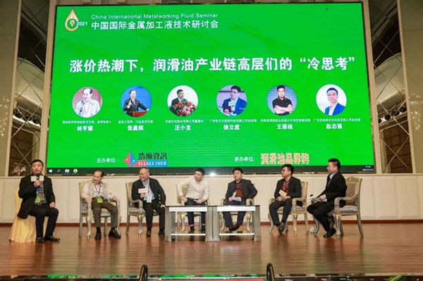 會議最后特邀國務院特殊津貼技術專家、教授級高工林亨耀老師、行業(yè)資深專家高工張晨輝老師、安美科技汪小龍董事長、方川潤滑科技徐立庶總經理、科萊恩大中華區(qū)王榮桂銷售經理、鉑索新材料趙志強總經理圍繞“漲價潮”、“碳中和”等議題展開開放式討論,共謀潤滑產業(yè)變革新路徑,共話金屬加工發(fā)展新未來。