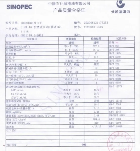 首先給大家?guī)硪粡埉a(chǎn)品質(zhì)量合格證,可以看到有許多的項目,如黏度、傾點和凝點、閃點、酸值、水份等等。