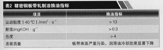 為了確保精密銅板帶軋制油的使用性能,良好的日常監(jiān)控和維護(hù)十分重要。這不僅有利于延長精密銅板帶軋制油的使用壽命,降低成本,而且有利于板材的表面質(zhì)量和精度。精密銅板帶軋制油的常規(guī)性能指標(biāo)包括運(yùn)動(dòng)黏度、閃點(diǎn)、傾點(diǎn)、水分、灰分、酸值、銅片腐蝕、餾程、最大無卡咬負(fù)荷、氧化安定性等,其日常監(jiān)測(cè)項(xiàng)目及維護(hù)要求見表1,換油指標(biāo)要求見表2 。