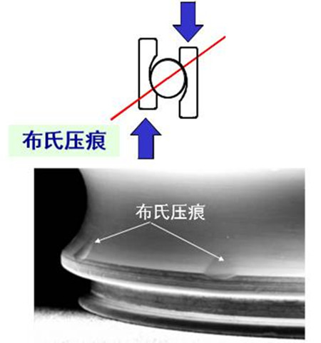 但,如果不是這樣,而是讓內(nèi)外圈相對(duì)受力了呢?那就會(huì)如下面這樣的圖示,產(chǎn)生了布氏壓痕。
