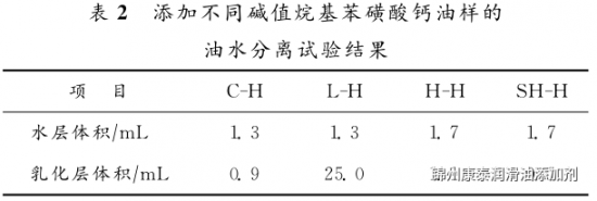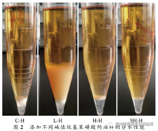 在磺酸鈣清凈劑中,硫含量代表著表面活性組分的含量,鈣含量代表著堿性組分的含量。隨著堿值的增加,硫含量降低,鈣含量增加,硫含量與鈣含量呈負(fù)相關(guān)。L、H之間硫含量、鈣含量的差異比H、SH之間硫含量、鈣含量的差異大(見(jiàn)表1),與油樣L-H、H-H的油水混合物離心后的水層體積和乳化層體積的差異比油樣H-H、SH-H的油水混合物離心后的水層體積和乳化層的體積差異大相對(duì)應(yīng)。由于合成L,H,SH的原料烷基苯磺酸的結(jié)構(gòu)相同,清凈劑中表面活性組分的活性相同,所以油樣分水性能的變化,主要與清凈劑中表面活性組分(尤其是游離的表面活性組分)和堿性組分的含量相關(guān)。清凈劑堿值越大,堿性組分含量越高,而表面活性組分的含量則越少,油樣抗乳化性則越好,因而分水性越好。