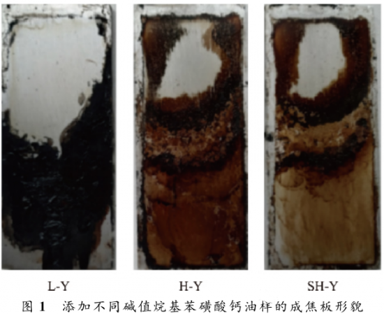 將L,H,SH按質(zhì)量分?jǐn)?shù)2%分別加入到Y(jié)ubase 6基礎(chǔ)油中,配制成油樣,分別命名為L(zhǎng)-Y,H-Y,SH-Y,并評(píng)價(jià)其高溫清凈性。成焦板試驗(yàn)主要從兩個(gè)方面評(píng)價(jià)油樣的高溫清凈性:成焦量和成焦形貌。通過(guò)稱(chēng)量試驗(yàn)前后鋁板的質(zhì)量可知,油樣L-Y,H-Y,SH-Y的成焦量分別為 129.4,60.2,74.9mg,說(shuō)明添加高堿值和超高堿值烷基苯磺酸鈣油樣的高溫清凈性比添加低堿值烷基苯磺酸鈣的油樣更好。而H-Y的成焦量比SH-Y更低,可能是因?yàn)楦邏A值烷基苯磺酸鈣組成中表面活性劑與堿性組分比例較超高堿值烷基苯磺酸鈣更優(yōu),從而使其增溶分散作用和酸中和作用得到充分發(fā)揮,因而成焦量較少。