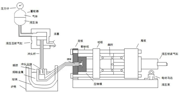 壓鑄設(shè)備將電機(jī)的電能通過馬達(dá)轉(zhuǎn)換為泵的液壓能,從而進(jìn)行動作(即打開和關(guān)閉模具以及噴射熔化金屬進(jìn)入模具型腔)。