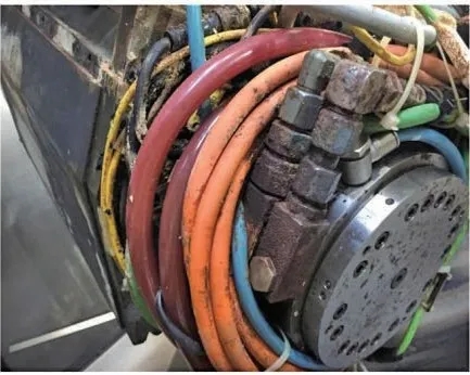 設備廠家維修拆開主軸內(nèi)部發(fā)現(xiàn),各種電氣管線都附著一些黃褐色物質(zhì),金屬表面已出現(xiàn)銹蝕現(xiàn)象,部分電氣管線外層膠皮已腐蝕硬化脫落,個別管線內(nèi)部已進入切削液,故障分析之后發(fā)現(xiàn)與切削液有關。因為主軸管線內(nèi)部結構復雜且腐蝕程度已造成故障隱患,需要對管線整體進行更換,但機床配件進口周期較長,造成長時間停機維修,損失較大。