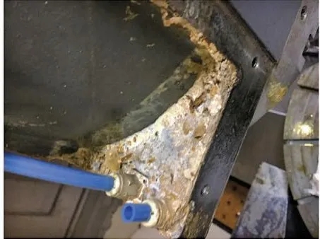 原因二,車間劃線工序為了在工件毛坯劃出清晰的線條,一直在毛坯表面涂一層白色石灰水,長時間的應用使得大量石灰水混合在切削液內(nèi),切削液硬度升高,導致切削液皂析出,造成機床密封處積有附著力很強且較難去除的結垢物質(zhì),致使機床密封性能下降。
